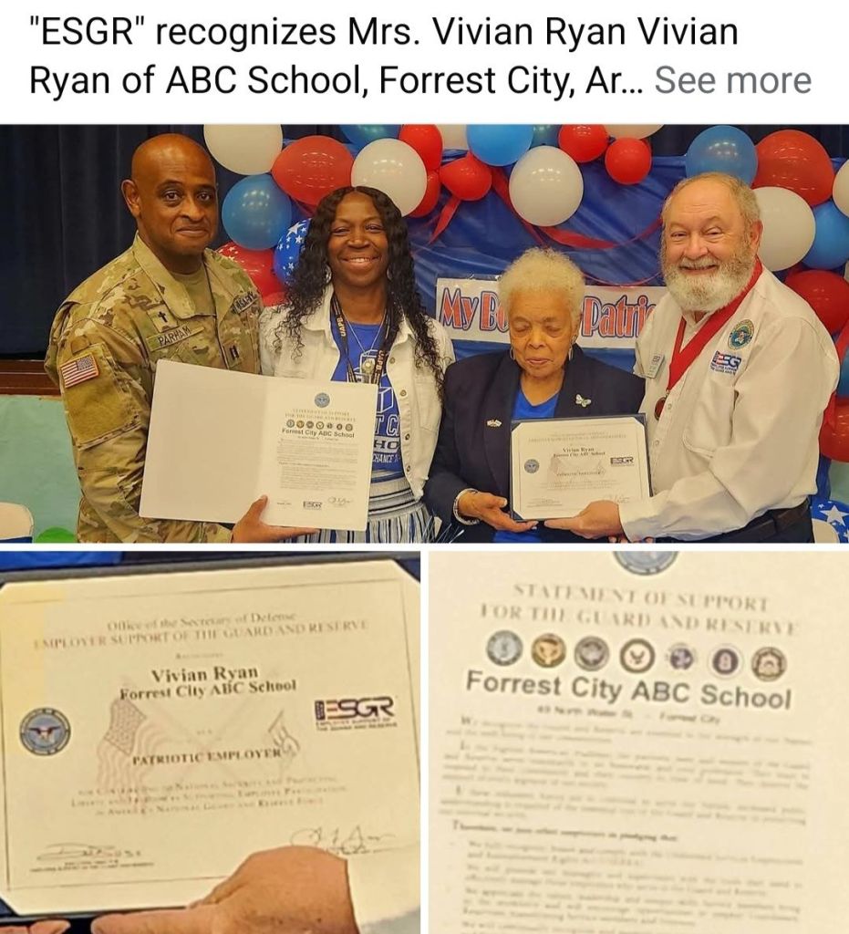 “ESGR” recognizes Mrs. Vivian Ryan Vivian Ryan of ABC School, Forrest City, ArkansasChaplain (CPT) Arlen K Parham & wife Paula Parham along National and Local “ESGR” recognize Mrs. Vivian Ryan of ABC School for her support.Employer Support of the Guard and reserve is a Defense Department office that works with civilian employers to resolve conflicts that arise due to Reserve Component service members’ military commitment. ESGR volunteer staff work to promote and enhance employer support for military service member and their families in the Guard and reserve.This benefit helps National Guard and reserve service members by working with their employers and helping to ensure that service members receive the full protections afforded to them by the Uniformed Services Employment and Reemployment Rights Act of 1994, or USERRA